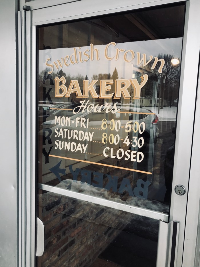 The first day of February delivered warmer weather with the sun sticking around long enough to melt some of the snow build-up. After settling a bellyful of pancakes and coffee, we ventured out to brave the perils of Saturday Costco. The town of Anoka lies on the way to the bastion of bulk food shopping, and in this town (self-proclaimed Halloween capital of the world) is The Swedish Crown Bakery